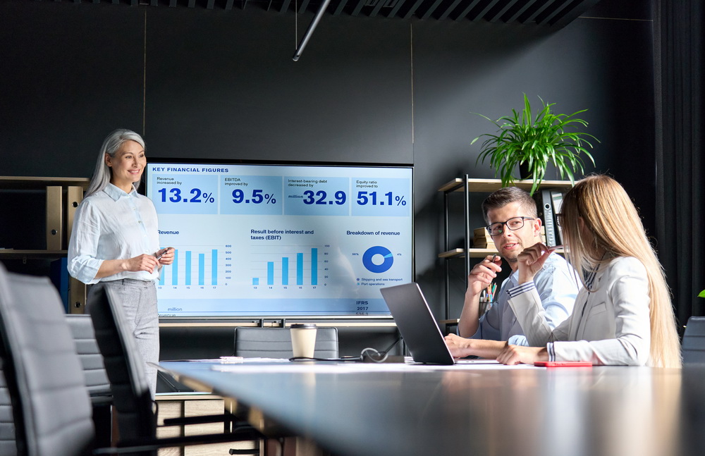 Middle aged happy successful Asian business woman ceo executive manager presenting to colleagues trainees interns income revenue financial data research results on big screen in modern office.